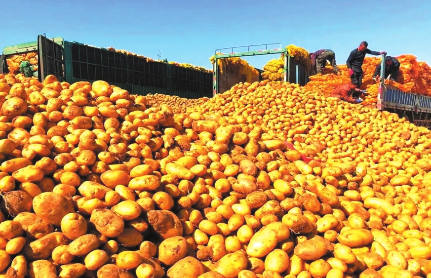 大田作物中,玉米貢獻(xiàn)了秋收“主色調(diào)”:玉米田穗大粒滿,金黃果穗綴滿秸稈,機械化收割設(shè)備穿梭田間。高粱與谷子在丘陵山區(qū)長勢喜人,紅透的高粱穗與沉甸甸的谷穗隨風(fēng)搖曳。土豆則以“地下黃金”之姿獲得豐產(chǎn),圓整塊莖從土壤中翻出,分揀后裝車外運。