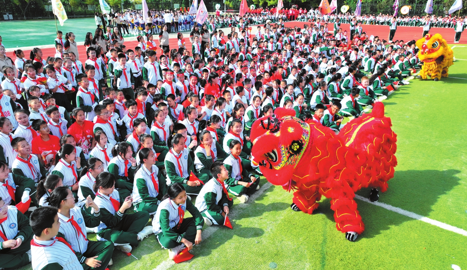 9月28日,忻州市長征小學(xué)西校區(qū)舉行第二屆秋季田徑運動會。圖為開幕式上孩子們與“獅”互動。(記者 張存良攝