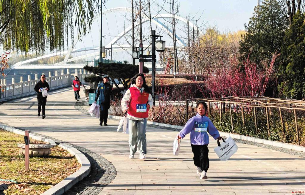 11月15日,“關(guān)愛河湖 保護母親河”河動快閃跑·全省聯(lián)動點線護水行忻州站活動在云中河溫泉旅游度假區(qū)舉行。近兩百名參與者手持垃圾袋、夾子,邊慢跑邊撿拾垃圾,將健身與護河融為一體。 (記者 張存良攝)