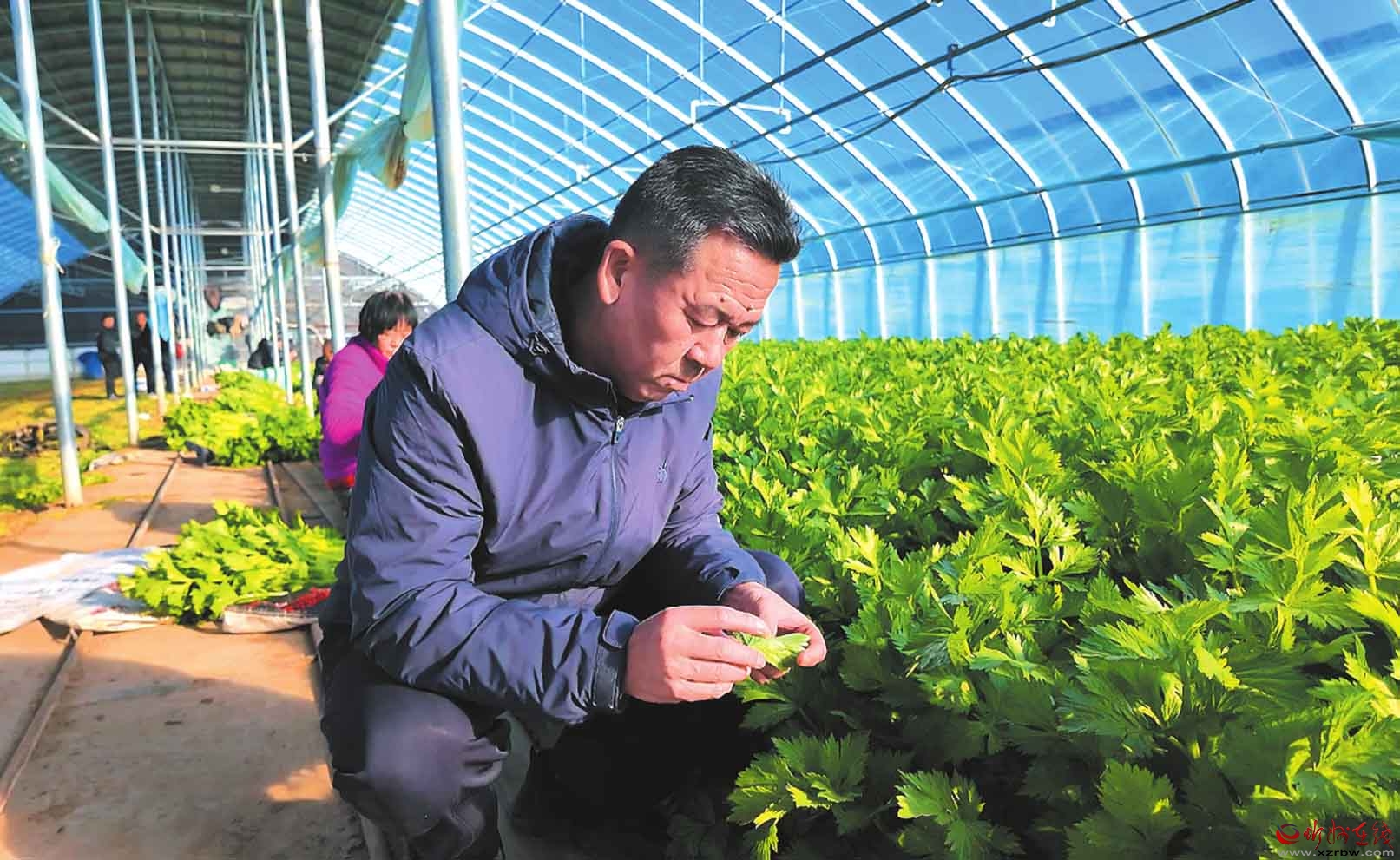 近日,忻府區(qū)農(nóng)業(yè)農(nóng)村局組織農(nóng)技專家團隊深入忻口鎮(zhèn)高標準蔬菜育苗基地,開展越冬作物防寒防凍技術指導。圖為農(nóng)技專家查看芹菜生長狀態(tài)。(趙曼君攝)