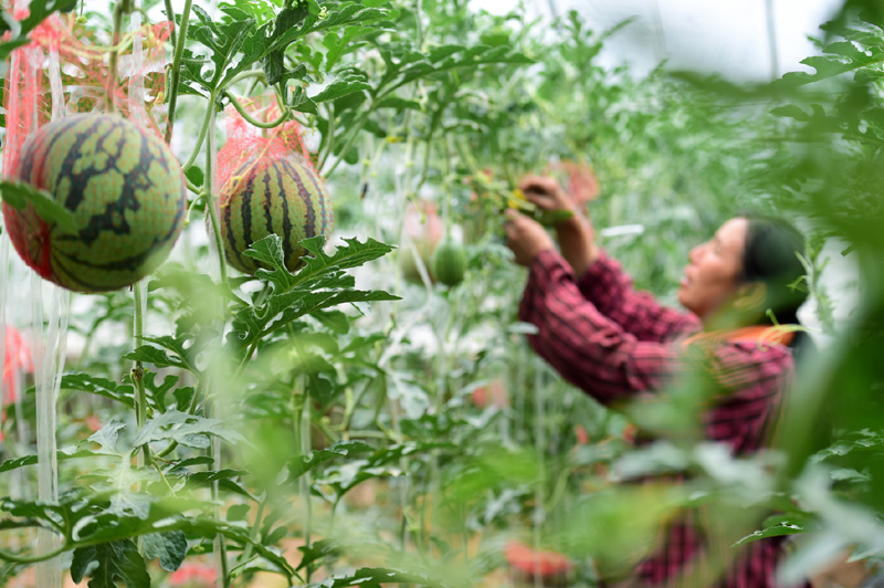 ▲5月7日,在河北省石家莊市靈壽縣三圣院鄉(xiāng)木佛莊園有機(jī)蔬菜種植基地,農(nóng)戶(hù)在管護(hù)大棚西瓜。