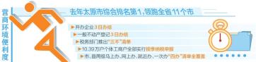 近日,記者從太原市政府新聞辦召開的新聞發(fā)布會上獲悉,山西省營商環(huán)境整體評估報告顯示,去年太原市營商環(huán)境便利度綜合排名第1,領跑全省11個市;在國家發(fā)改委組織的對包括直轄市、計劃單列市、省會城市在內的41座城市進行的營商環(huán)境評價中,太原市營商環(huán)境便利度獲評優(yōu)良。