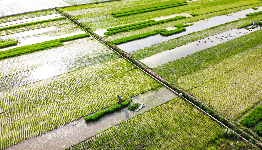 2020年6月14日,農(nóng)民在洛陽(yáng)市孟津縣會(huì)盟鎮(zhèn)黃河岸邊的萬(wàn)畝優(yōu)質(zhì)水稻種植示范基地內(nèi)移栽水稻秧苗(無人機(jī)照片)。新華社發(fā)(黃政偉 攝)