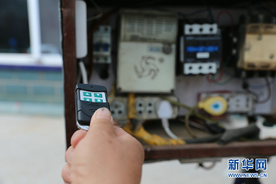 大棚里的噴灌設(shè)施可以通過遙控器控制,這是劉振義自己設(shè)計(jì)制作的“神器”。每天夜里,木耳大棚要澆兩次水,有了這個遙控器就不用再出門開關(guān)噴灌器了。新華網(wǎng)曹楨攝
