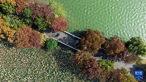 11月10日拍攝的南京玄武湖公園初冬景色(無人機照片)。(新華社發(fā) 孫忠南 攝)