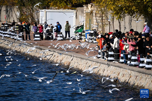 11月13日,游客在海河岸邊觀賞海鷗。(新華社記者 趙子碩 攝)