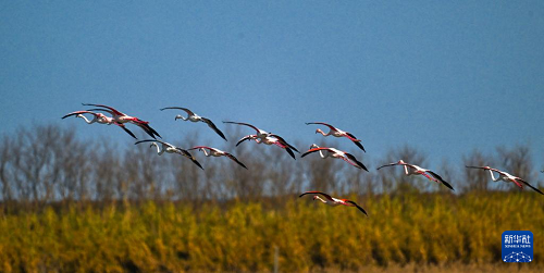 12月8日,火烈鳥在江蘇東臺(tái)條子泥濕地飛翔。(新華社發(fā) 孫家錄 攝)