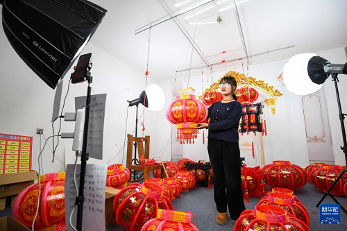 12月10日,在河北省石家莊市藁城區(qū)屯頭村一家宮燈銷(xiāo)售處,直播人員進(jìn)行線(xiàn)上銷(xiāo)售。(新華社發(fā) 張曉峰 攝)