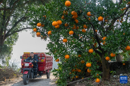 12月11日,在湖北省宜昌市長陽土家族自治縣漁峽口鎮(zhèn)巖松坪村,村民在轉(zhuǎn)運剛采摘的清江椪柑。(新華社記者 杜子璇 攝)