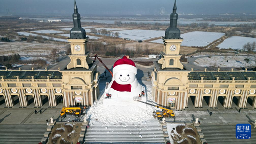 12月14日拍攝的建設(shè)中的哈爾濱市群力音樂公園網(wǎng)紅大雪人(無人機照片)。(新華社發(fā) 劉洋 攝)