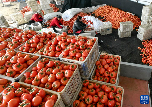 12月29日,肅寧縣萬里鎮(zhèn)一家蔬菜種植合作社的社員將收獲的西紅柿卸車。(新華社記者 楊世堯 攝)