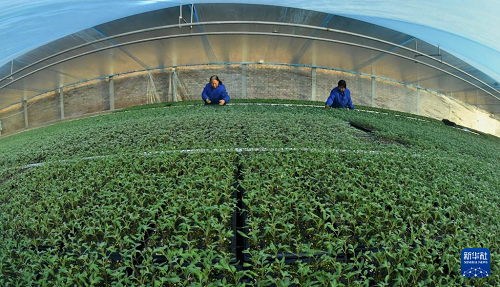 12月29日,肅寧縣領(lǐng)頭雁蔬菜苗繁育專業(yè)合作社的社員在大棚內(nèi)管理蔬菜苗。(新華社記者 楊世堯 攝)