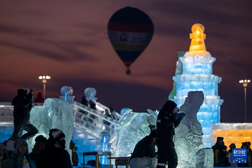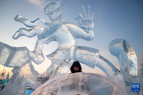 1月3日,參賽選手在哈爾濱冰雪大世界園區(qū)內(nèi)進(jìn)行冰雕創(chuàng)作。(新華社記者 張濤 攝)
