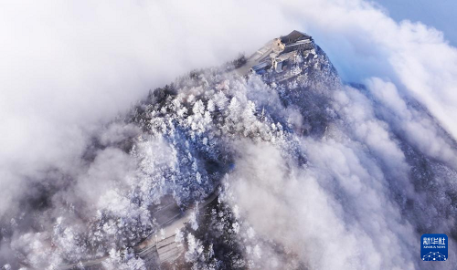 1月6日在南岳衡山風景區(qū)拍攝的霧凇云海景觀(無人機照片)。(新華社發(fā) 曹正平 攝)