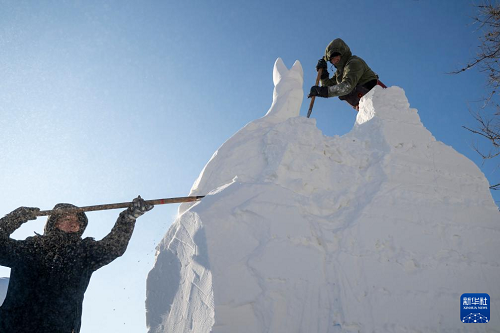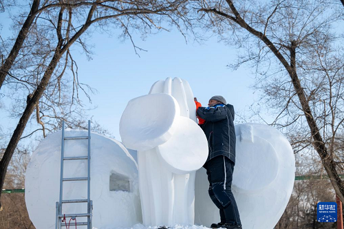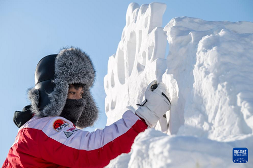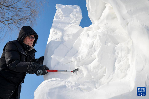 1月7日,在哈爾濱太陽島雪博會園區(qū),來自13個國家的25支代表隊百余位藝術(shù)家在寒冬中堅持藝術(shù)創(chuàng)作,精雕細(xì)琢雪雕作品。