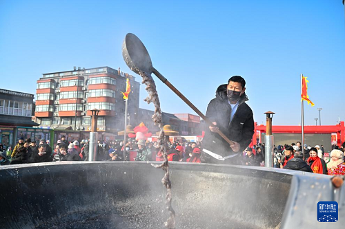1月26日,在天津蘆臺大集,工作人員為趕集市民熬制臘八粥。(新華社記者 孫凡越 攝)