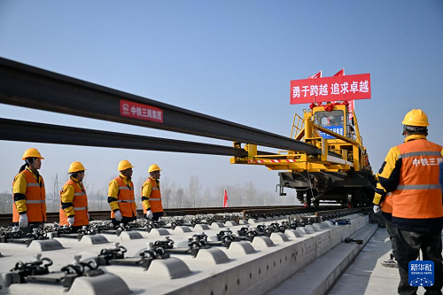 2月1日上午,在河北省保定市順平縣的雄忻高鐵建設(shè)現(xiàn)場(chǎng),中鐵三局集團(tuán)施工人員將首對(duì)500米長(zhǎng)鋼軌平穩(wěn)、精準(zhǔn)地鋪設(shè)在無砟道床上,標(biāo)志著雄忻高鐵正式進(jìn)入鋪軌施工階段。