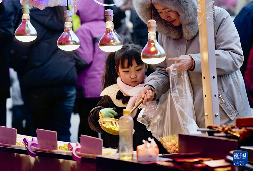 2月3日,游客在寧夏固原市西吉縣年貨大集上選購(gòu)美食。(新華社記者 楊植森 攝)