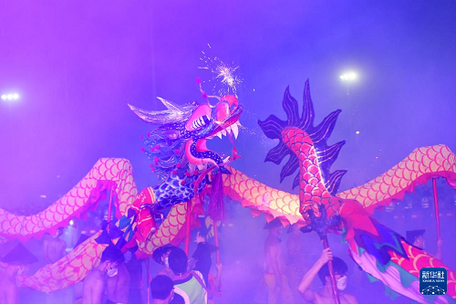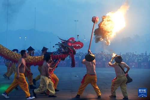 2月27日,在廣西賓陽(yáng)縣炮龍文化廣場(chǎng),人們?cè)谂邶埞?jié)上舞炮龍。(新華社記者 陸波岸 攝)