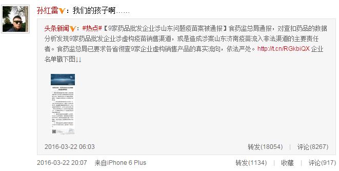 繼章子怡、賈乃亮等人在微博發(fā)聲關(guān)注疫苗安全問(wèn)題后,3月22日晚,孫紅雷也在微博心痛呼叫“我的孩子……”任賢齊在微博中寫道:“請(qǐng)重視并嚴(yán)懲無(wú)良商人!別讓這些混蛋荼毒孩子們的健康!”舒淇、趙薇也排隊(duì)轉(zhuǎn)發(fā)并利用自身名人效應(yīng)呼吁。