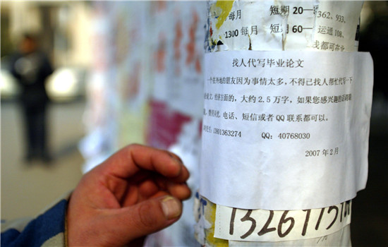 校園里,一則代寫論文的廣告。視覺中國(guó)供圖