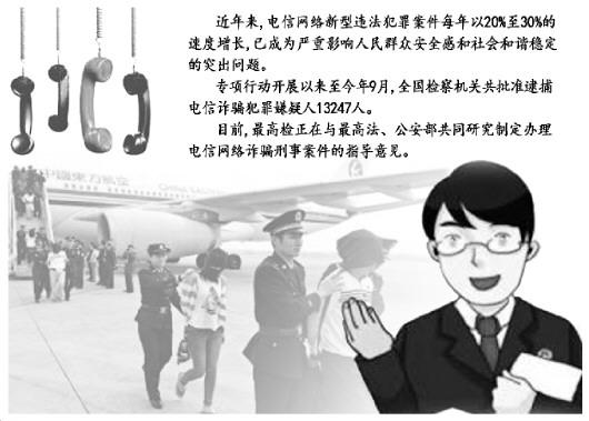 《法制日報》記者從最高人民檢察院與公安部近日聯合召開的電信網絡新型違法犯罪重點整治、突出地區(qū)督導會上了解到,被掛牌的7個重點地區(qū)和5個突出地區(qū)檢察機關積極主動作為,出重拳、下重手、用重典,快速批捕起訴了一批有震動、有影響的重大電信網絡詐騙犯罪案件,取得了初步成效。據統(tǒng)計,專項行動開展以來至今年9月,全國檢察機關共批準逮捕電信詐騙犯罪嫌疑人13247人。
