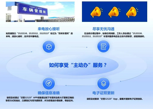 為了讓用戶更加安心地享受“主動辦”服務,忻州市公安局交警支隊特別提醒廣大車主和駕駛員:當您接到以“2122110、2122112、2122113”標注為“忻州車管所”的來電時,請放心接聽。這些電話是車管所工作人員為了提供更加貼心、精準的服務而撥打的,絕非詐騙電話。?
