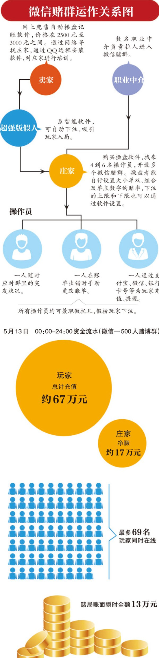 而且,微信賭博蔓延迅速、涉及面廣。玩法多樣,每個(gè)群都可以建立一套獨(dú)特的游戲規(guī)則,傳播速度呈裂變式擴(kuò)散。借著“紅包接龍”的瓶子,注入“下注博彩”“抽頭賺錢”的酒,表面是“輸贏皆可能”,但博彩者往往悲哀地發(fā)現(xiàn),最終贏得盆滿缽滿的總是群主、包主、財(cái)務(wù)等組織者,輸個(gè)一絲不掛的總是自己。當(dāng)圖好玩的“拼手氣”變成殺紅眼的“賭輸贏”,微信紅包原有的娛樂性蕩然無存,而變成充滿兇險(xiǎn)的賭場。