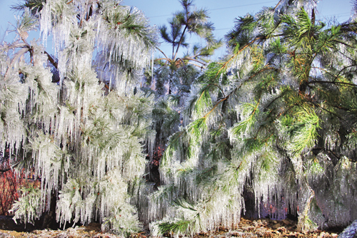 3月26日早晨,原平市交通公園的各種風(fēng)景樹木驚現(xiàn)樹掛冰凌奇觀,蔚為壯觀,吸引了市民前來觀賞。據(jù)了解,該樹掛冰凌是公園工作人員對(duì)各種花草樹木進(jìn)行春澆噴灌時(shí),由于早晨溫度較低,噴灌的霧狀水滴集結(jié)而成,到上午太陽光照下,此奇觀已經(jīng)消失。(吉建平 攝)
