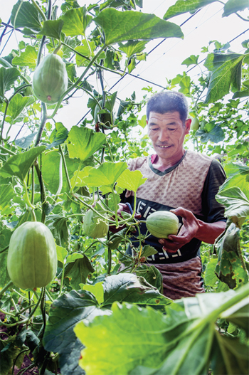 5 月14 日,忻府區(qū)部落村民在自家溫室大棚采摘甜瓜。他家種植溫室大棚甜瓜六七年了,今年采用了立體式種植甜瓜技術(shù),達到了甜瓜早上市、采摘時間長的目的,成了當?shù)胤N植甜瓜的技術(shù)帶頭人。(曹建國 攝)