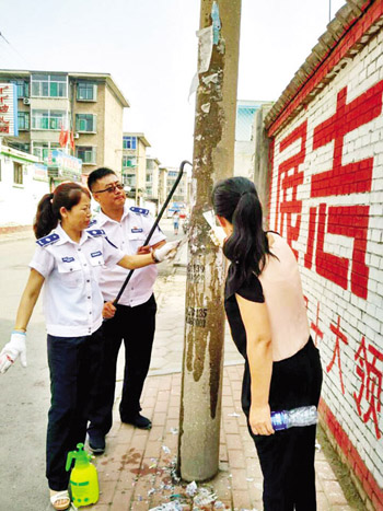 記者在利民西街看到,城管隊(duì)員手拿噴水器、小鏟子,對(duì)路邊電桿、墻壁、公交站牌等處的“小廣告”逐一認(rèn)真清理。不少“小廣告”由于粘貼得比較牢靠,隊(duì)員們用手撕扯后再?zèng)_洗,但被粘貼的位置依然留下了斑斑痕跡,再一次經(jīng)過重復(fù)操作,“小廣告”才被徹底清除。圖為工作人員正在清理“小廣告”(張志遠(yuǎn) 攝)