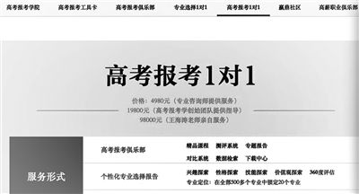 北青報(bào)記者發(fā)現(xiàn),面對(duì)考生家長(zhǎng)對(duì)于志愿填報(bào)的“迫切需求”,目前高考志愿填報(bào)咨詢(xún)的價(jià)格都在幾千元到幾萬(wàn)元不等。這位潘姓工作人員表示,該機(jī)構(gòu)設(shè)有線(xiàn)上、線(xiàn)下志愿填報(bào)兩套方案,其中線(xiàn)上填報(bào)方案價(jià)格為3980元,志愿填報(bào)咨詢(xún)老師與學(xué)生并不見(jiàn)面,而是通過(guò)QQ、郵件等方式為學(xué)生和家長(zhǎng)出具志愿填報(bào)方案。而線(xiàn)下志愿填報(bào)方案為1對(duì)1有針對(duì)性的填報(bào),但是根據(jù)咨詢(xún)經(jīng)驗(yàn)的多寡收費(fèi)也不相同?!氨热缥覀冇衅甙四晷袠I(yè)經(jīng)驗(yàn)的呂老師收費(fèi)是22800元,有6年經(jīng)驗(yàn)的郭老師收費(fèi)是20800元,要是有3年經(jīng)驗(yàn)的李老師收費(fèi)則為16800元。”此外,一家名為融聚未來(lái)的機(jī)構(gòu)的高姓負(fù)責(zé)人也向記者介紹,該機(jī)構(gòu)高考志愿填報(bào)1對(duì)1服務(wù)的價(jià)格在8000元到2萬(wàn)元以?xún)?nèi)。最讓人吃驚的是,一家名為贏(yíng)鼎教育的高考報(bào)考機(jī)構(gòu),在官網(wǎng)上明示的高考報(bào)考1對(duì)1項(xiàng)目中明確標(biāo)價(jià),專(zhuān)業(yè)咨詢(xún)師提供服務(wù)的收費(fèi)4980元,高考報(bào)考學(xué)創(chuàng)始團(tuán)隊(duì)提供指導(dǎo)的收費(fèi)為19800元,王海濤老師親自服務(wù)的標(biāo)價(jià)為98000元。