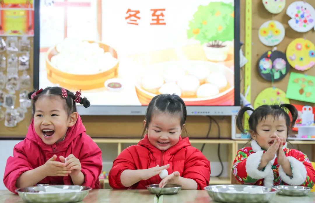 2024年12月20日,貴州省貴陽市開陽縣第二幼兒園的小朋友們在“知習俗 迎冬至”活動中學習搓湯圓。袁福洪 攝