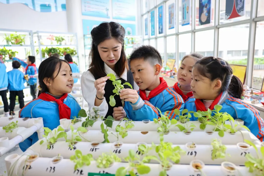 2024年11月21日,在湖北省襄陽市大慶路小學“校園農(nóng)場”,老師正在講解水培植物的相關(guān)知識。聶志鵬 付小方 攝