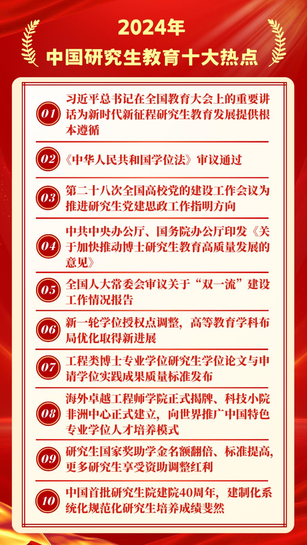 2024年,是中國學位與研究生教育發(fā)展史上具有重要里程碑意義的一年,在教育部學位管理與研究生教育司指導(dǎo)下,教育部學位與研究生教育發(fā)展中心《中國研究生》雜志回顧總結(jié)全年研究生教育大事要事和熱點動態(tài),聯(lián)合人民網(wǎng)、新華網(wǎng)、中國教育報和有關(guān)研究生教育媒體等共同發(fā)布2024年中國研究生教育十大熱點。