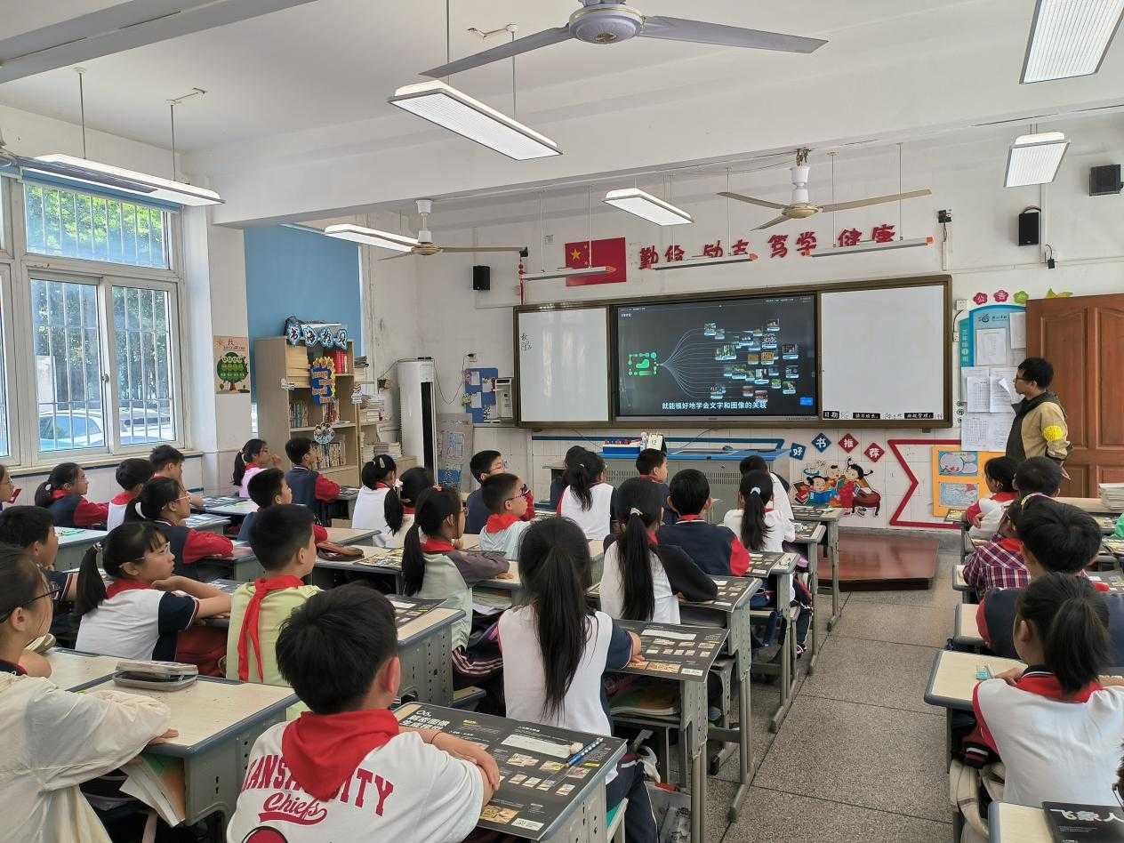陳娟介紹,該校去年起引入“飛象人工智能通識課”,采用螺旋式進階設(shè)計,10門、160節(jié)分層進階的課程體系,貫穿真實生活場景。記者現(xiàn)場看到,在“智能雙師”授課模式下,線上大屏的老師設(shè)計課程任務(wù),線下課堂老師把控課堂節(jié)奏,組織學生互動討論,并對討論成果實時評價。