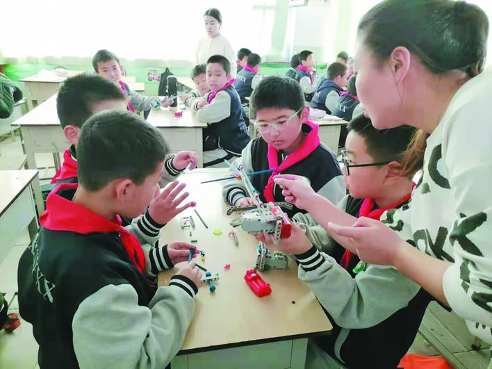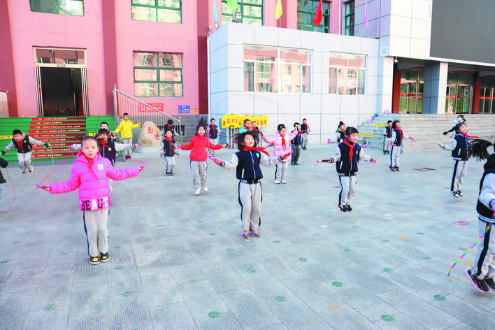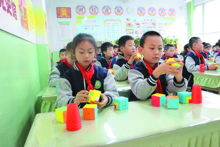 冬日暖陽下,忻州市實(shí)驗(yàn)小學(xué)校園里一派生機(jī)勃勃的景象。武術(shù)訓(xùn)練場上,孩子們正在認(rèn)真扎馬步、練拳術(shù),一招一式打得虎虎生威,眼睛里閃爍著堅(jiān)毅和自信的光芒。百人腰鼓隊(duì)排著整齊的隊(duì)伍,伴著音樂的節(jié)奏不停變換著步伐,鼓槌上的紅綢子上下舞動(dòng),看得人眼花繚亂?;ㄊ交@球挑戰(zhàn)籃球極限,展示籃球技術(shù)和表演的完美結(jié)合?;犹K中,孩子們在環(huán)擺的繩索中做著各種跳躍動(dòng)作……操場上,熱火朝天,教學(xué)樓里,每一間教室里都散發(fā)著濃濃的趣味性?!耙黄惨晦啵瑫鴮懱锰谜袊帧薄熬幊桃⒁膺壿嬯P(guān)系”“三原色是哪些顏色呢?”……這是市實(shí)驗(yàn)小學(xué)每周三開展的第二課堂綜合實(shí)踐活動(dòng),也是孩子們最興奮最高興的校園時(shí)光。