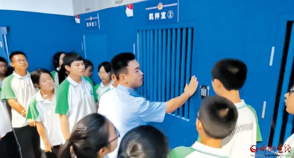 法院干警向?qū)W生們展示警用器械,詳細介紹了八件套、電子腳銬、束縛帶、盾牌等常用器械的使用方法和適用場合。大家聽完后,顯示出濃厚興趣,躍躍欲試,在法警叔叔的指導下,體驗了各類警用器械。之后,學生們還參觀了羈押室。