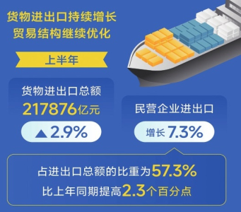 貨物進(jìn)出口持續(xù)增長,貿(mào)易結(jié)構(gòu)繼續(xù)優(yōu)化。上半年,貨物進(jìn)出口總額217876億元,同比增長2.9%。民營企業(yè)進(jìn)出口增長7.3%,占進(jìn)出口總額的比重為57.3%,比上年同期提高2.3個(gè)百分點(diǎn)。