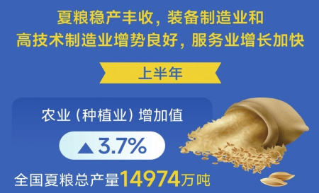 夏糧穩(wěn)產(chǎn)豐收,裝備制造業(yè)和高技術(shù)制造業(yè)增勢(shì)良好,服務(wù)業(yè)增長加快。上半年,農(nóng)業(yè)(種植業(yè))增加值同比增長3.7%,全國夏糧總產(chǎn)量14974萬噸;全國規(guī)模以上工業(yè)增加值同比增長6.4%,其中裝備制造業(yè)增加值同比增長10.2%,高技術(shù)制造業(yè)增加值增長9.5%,增速分別快于全部規(guī)模以上工業(yè)3.8和3.1個(gè)百分點(diǎn);服務(wù)業(yè)增加值同比增長5.5%,比一季度加快0.2個(gè)百分點(diǎn)。