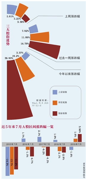 新京報(bào)記者統(tǒng)計(jì)了2010年7月-2019年7月間的數(shù)據(jù)發(fā)現(xiàn),事實(shí)上,指數(shù)在過去的10年中上漲與下跌的各約占半數(shù)。其中,滬指方面,近10年里,滬指6次在7月出現(xiàn)上漲,4次出現(xiàn)下跌。2010年7月為近10年的7月里上漲幅度最高的一年,漲幅為9.97%;2015年7月,滬指大幅下跌14.34%,是十年中7月跌幅最高的一年。