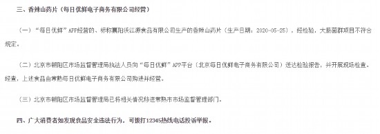 《通告》指出,北京市朝陽(yáng)區(qū)市場(chǎng)監(jiān)督管理局執(zhí)法人員向“每日優(yōu)鮮”APP平臺(tái)(北京每日優(yōu)鮮電子商務(wù)有限公司)送達(dá)檢驗(yàn)報(bào)告,并開展現(xiàn)場(chǎng)檢查。經(jīng)查,上述食品由常熟每日優(yōu)鮮電子商務(wù)有限公司購(gòu)進(jìn)并經(jīng)營(yíng)。北京市朝陽(yáng)區(qū)市場(chǎng)監(jiān)督管理局已將相關(guān)情況移送常熟市市場(chǎng)監(jiān)督管理部門。
