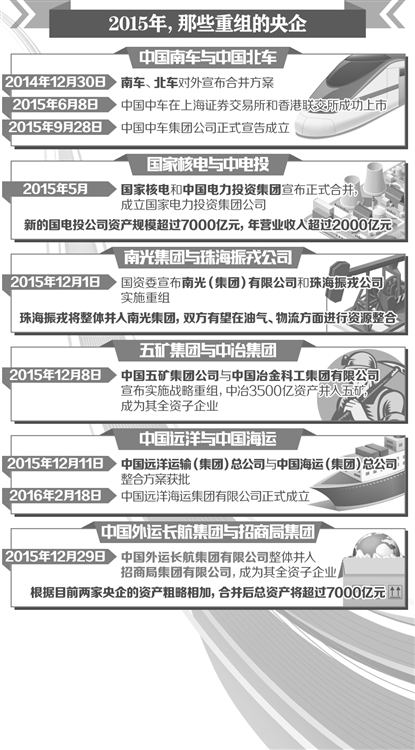 2015年,央業(yè)重組邁出重要步伐。有6對12家企業(yè)完成了重組,涉及至少27家上市公司,一批包括裝備制造、能源、航運(yùn)在內(nèi)的央企實(shí)現(xiàn)兼并重組,中央企業(yè)也由112家減至106家。2016年以來,繼1月25日中材集團(tuán)與中建集團(tuán)發(fā)布公告稱實(shí)施戰(zhàn)略重組之后,中國國旅集團(tuán)與中國港中旅集團(tuán)也發(fā)布公告稱籌劃戰(zhàn)略重組。此外,中航動(dòng)力、成發(fā)科技、中航動(dòng)控三家公司則于日前發(fā)布重組公告。離國務(wù)院國資委直接監(jiān)管的中央企業(yè)數(shù)量減至100家僅有“一步之遙”。