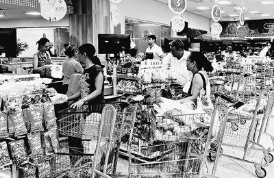 由于巴西通貨膨脹攀升導致消費不振,民眾購物更趨謹慎。圖為在里約熱內盧一家超市,當?shù)孛癖娫诓少徤畋匦杵?。記?顏 歡攝