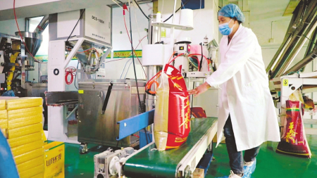 位于蔡家會(huì)鎮(zhèn)的興縣山花爛漫農(nóng)業(yè)綜合開(kāi)發(fā)有限公司,日精加工50噸谷子成套設(shè)備生產(chǎn)流水線上,經(jīng)過(guò)初篩、精選、加工、包裝后的袋裝小米經(jīng)過(guò)傳輸帶被送往庫(kù)房,等待裝車發(fā)貨?!拔覀兊漠a(chǎn)品涵蓋有機(jī)小米、綠豆、莜面、豇豆面、亞麻籽油等,年加工雜糧、油料可達(dá)4萬(wàn)多噸。”公司董事長(zhǎng)賀虎平介紹,自2005年“山花爛漫”商標(biāo)注冊(cè)以來(lái),已與興縣50多個(gè)自然村,916戶農(nóng)戶,簽訂訂單農(nóng)業(yè)近3萬(wàn)畝,其中脫貧戶430多戶,戶均收入達(dá)到1.5萬(wàn)余元/年。