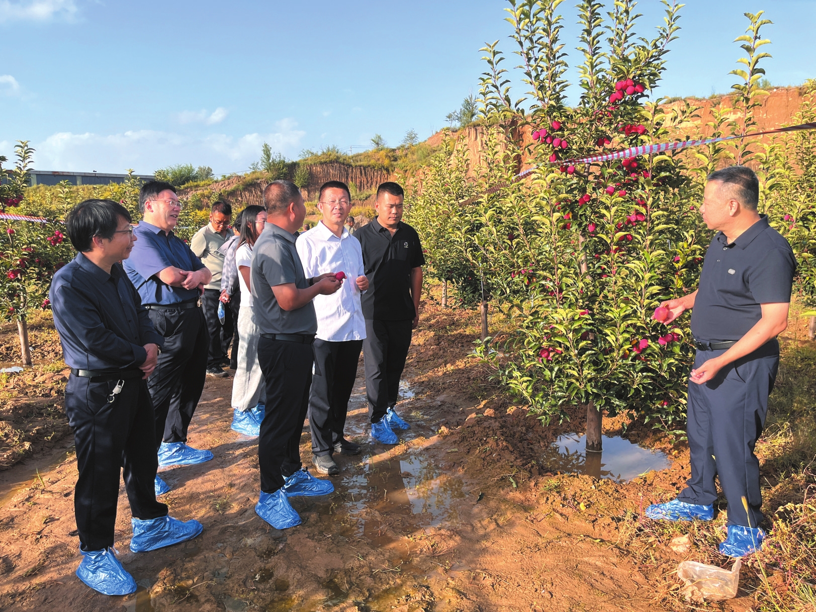 觀摩期間,技術(shù)人員全面介紹了示范果園的建設背景、關(guān)鍵栽培技術(shù)及主要管理措施,重點講解了河曲紅海棠的品種特性、創(chuàng)新技術(shù)應用成效等核心亮點。參會人員深入田間,實地察看果樹長勢與掛果情況,并與技術(shù)團隊現(xiàn)場交流,詳細了解配套栽培措施、季節(jié)性管理要點及該品種在新技術(shù)模式下的實際生長狀況,進一步加深了對對品種優(yōu)勢與技術(shù)推廣成效的認識。