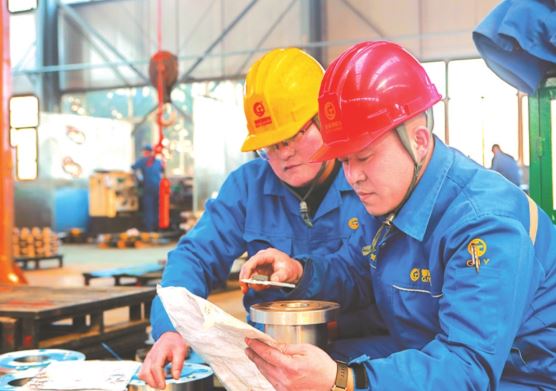 劉振偉(右)按照圖紙測量法蘭。李春澤攝