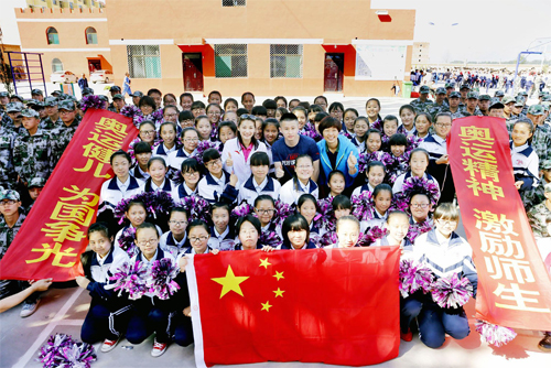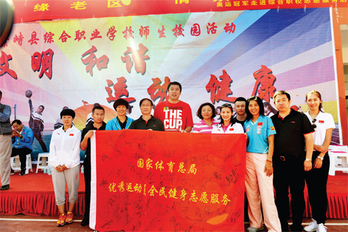 圖為體育健兒與繁峙縣活動現(xiàn)場的同學(xué)們合影留念。
