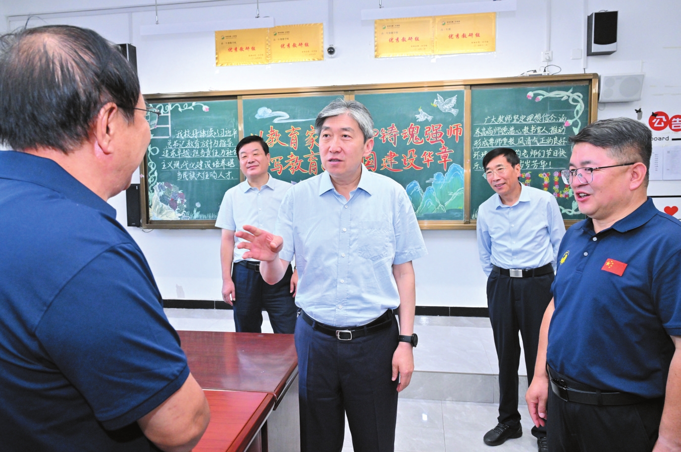 市委書記朱曉東在忻州市第一中學校慰問一線教師。本報記者馮曉磊攝 本報訊(記者魏鵬飛)在第41個教師節(jié)到來之際,9月9日,市委書記朱曉東深入忻州城區(qū)中小學校,看望慰問辛勤耕耘在教學一線的教師代表,并代表市委、市政府向全市廣大教師和教育工作者致以節(jié)日祝賀和誠摯問候。市委常委、秘書長溫建軍參加。 朱曉東先后來到忻州市第一中學校、忻州市杏林小學和忻州實驗中學,聽取學校師資力量、辦學特色、教學成果等情況介紹,參觀校園環(huán)境和配套教學設(shè)施,走進教研組看望慰問一線教師職工和模范教師代表,了解教師的工作生活情況,傾聽教師的意見和建議,感謝他們長期以來堅守崗位、默默奉獻,為推動忻州教育事業(yè)高質(zhì)量發(fā)展作出的積極貢獻,并送上鮮花與節(jié)日祝福。朱曉東還特別與新入職教師進行了交流,鼓勵他們扎根講臺、快速成長。 朱曉東指出,教師是立教之本、興教之源。全市廣大教師和教育工作者要始終牢記為黨育人、為國育才的初心使命,大力弘揚“教育家精神”,不斷提高教書育人本領(lǐng)和教育教學質(zhì)量,努力培養(yǎng)更多有用之才。要加強教師隊伍建設(shè),強化業(yè)務(wù)培訓,建強人才梯隊,完善人才引領(lǐng)和保障機制,從嚴加強師德師風建設(shè)。要堅持德育為先,扎實做好思想教育工作,引導學生樹立正確的世界觀、人生觀、價值觀。要注重學生全面發(fā)展,保障學生運動需求,關(guān)注學生心理健康,進一步優(yōu)化教育關(guān)懷機制。要持續(xù)筑牢校園安全防線,常態(tài)化抓好校園食品安全、交通安全、消防安全等工作,全力呵護學生健康成長。市委、市政府會一如既往、滿懷熱情地關(guān)心、關(guān)愛、支持教師,持續(xù)優(yōu)化教育發(fā)展環(huán)境,完善待遇保障機制,營造尊師重教濃厚氛圍,激勵廣大教師為我市教育強市建設(shè)譜寫新篇章。