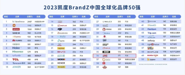 6月中旬,全球知名品牌排行榜凱度BrandZ攜手谷歌發(fā)布了《2023凱度BrandZ中國全球化品牌50強》榜單,江淮汽車位列中國全球化品牌第36位,相較2022年上升了4個名次,這是江淮汽車連續(xù)三年榮登該榜單,展現(xiàn)了持續(xù)、強勁的品牌增長勢頭。